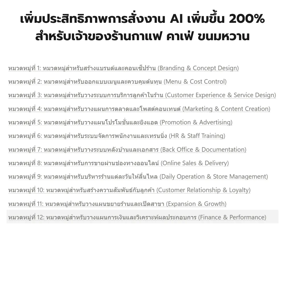 E-book 120 คำสั่งขั้นสูงสำหรับร้านกาแฟและของหวานโดยเฉพาะ (Ultimate Prompt Book: 120 Advanced AI Prompts for Cafe & Dessert Shop)