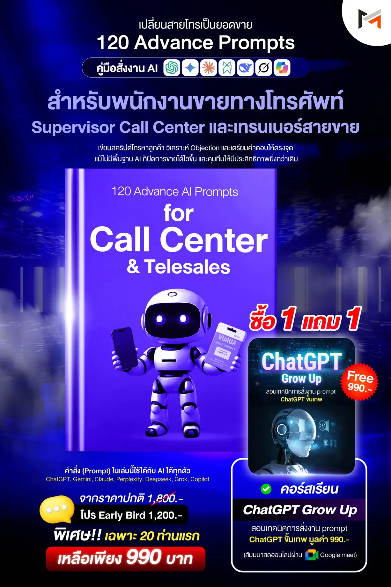 เล่มนี้คือ “AI Prompt Book” สำหรับสายงานบริการและขายทางโทรศัพท์ – ช่วยให้คุณพูดตอบไว เขียนสคริปต์ขายดูโปร และพร้อมรับมือลูกค้าทุกสถานการณ์