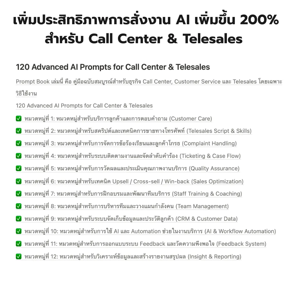 E-book 120 คำสั่งขั้นสูงสำหรับงาน Call Center และ Telesales มืออาชีพ (Ultimate Prompt Book: 120 Advanced AI Prompts for Call Center & Telesales)