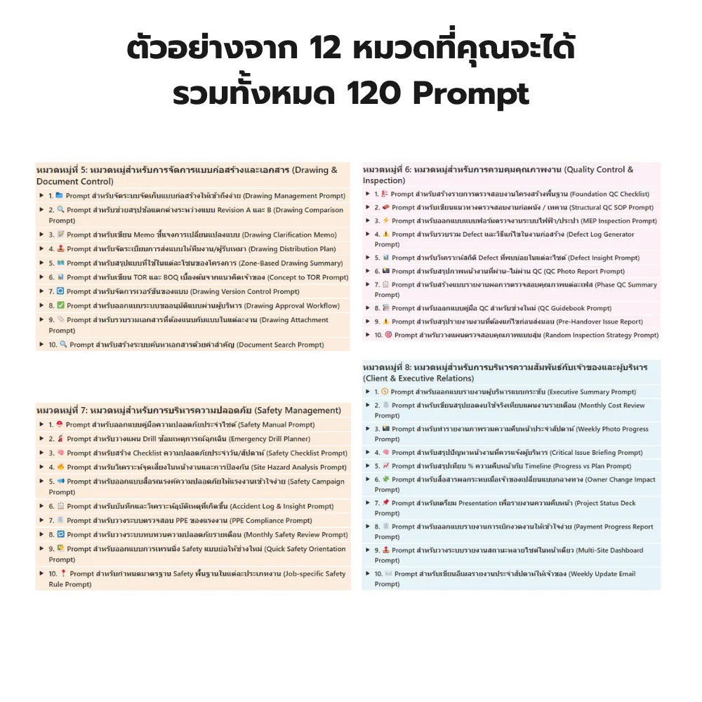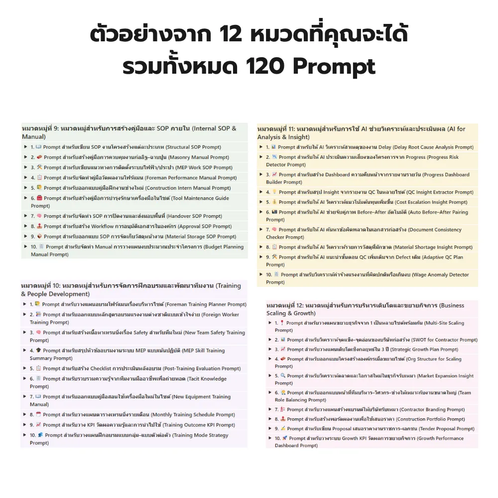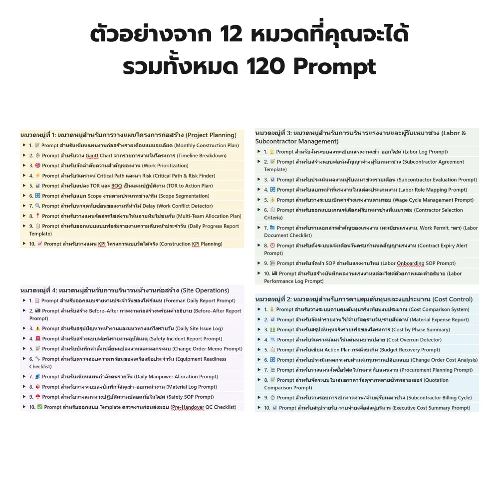 E-book 120 คำสั่งขั้นสูงสำหรับผู้รับเหมาก่อสร้างโดยเฉพาะ (Ultimate Prompt Book: 120 Advanced AI Prompts for Construction Contractors)