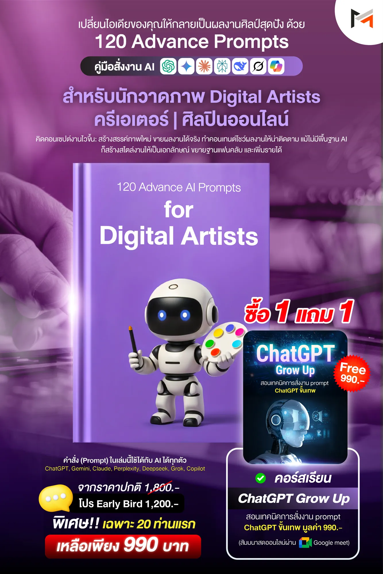 เล่มนี้คือ “AI Prompt Book” ที่ออกแบบมาเพื่อ Digital Artists – ช่วยให้คุณคิดคอนเทนต์ไว เขียนคำอธิบายงานได้โดน และสร้างภาพลักษณ์แบรนด์ให้ชัดเจน