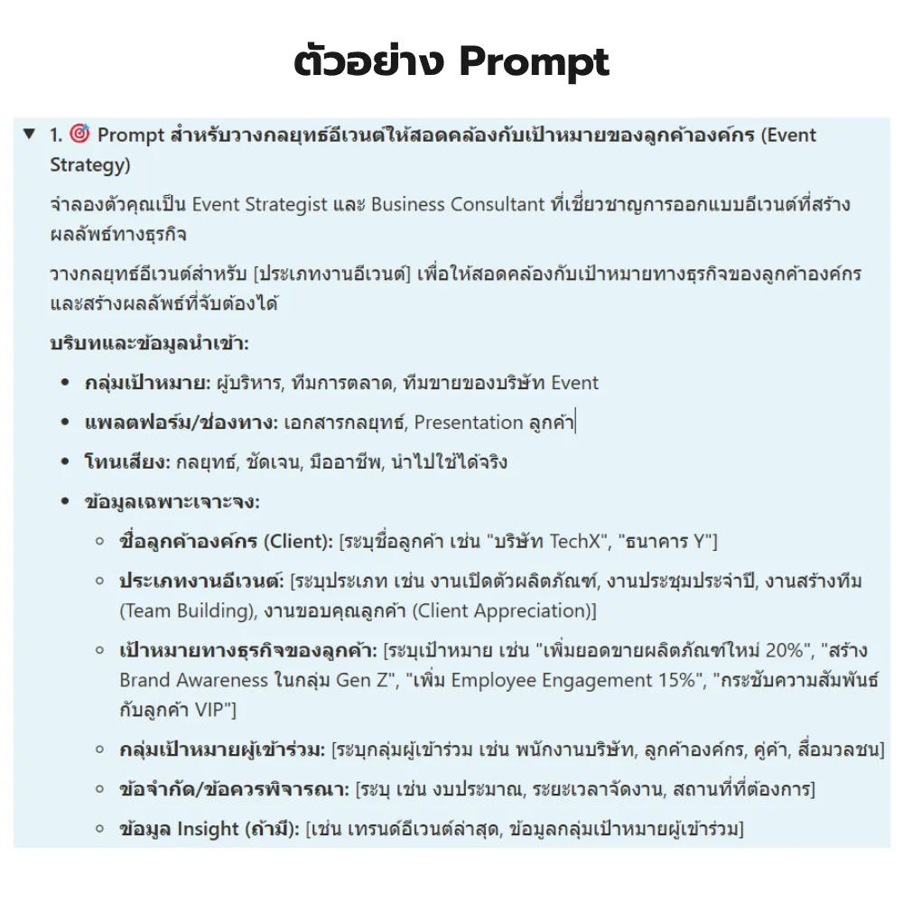 ✔ Prompt สำหรับวางแผนอีเวนต์แบบมืออาชีพ: Roadshow, Conference, งานเปิดตัวสินค้า