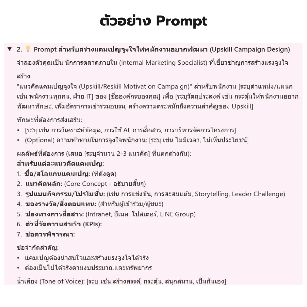 ✔ Prompt สำหรับเขียนเนื้อหาเทรนนิ่ง / แบบประเมินก่อน–หลังอบรม / สื่อสารเป้าหมายกับทีม