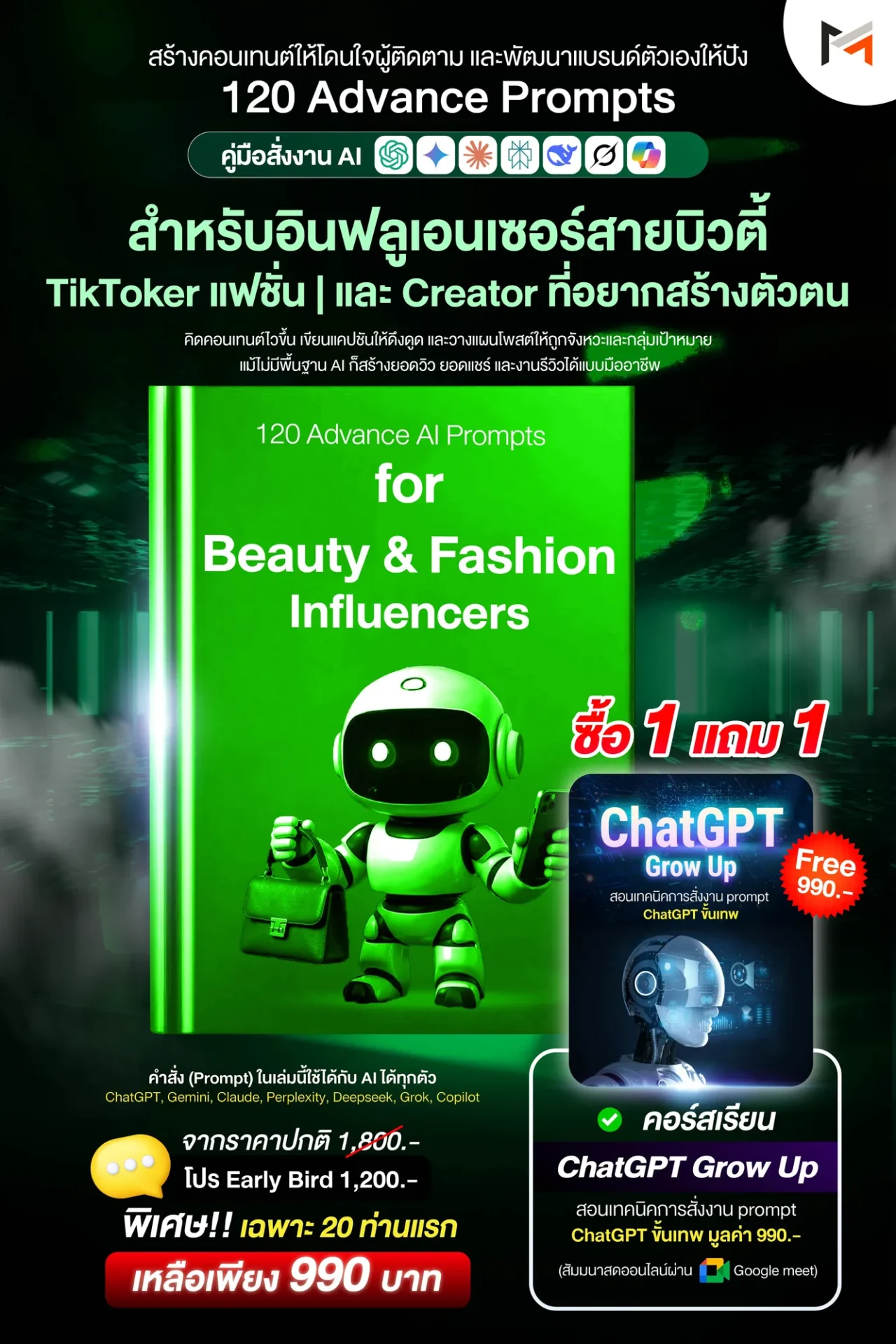 เล่มนี้คือ “ผู้ช่วย AI” ที่ออกแบบมาเฉพาะสำหรับสายบิวตี้ แฟชั่น ไลฟ์สไตล์ – ช่วยให้คุณมีคอนเทนต์ไว สื่อสารปัง และทำงานง่ายขึ้น