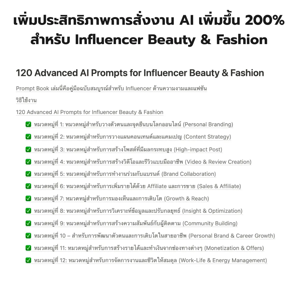 E-book 120 คำสั่งขั้นสูงสำหรับอินฟลูเอนเซอร์สายความงามและแฟชั่นโดยเฉพาะ (Ultimate Prompt Book: 120 Advanced AI Prompts for Influencer Beauty & Fashion)