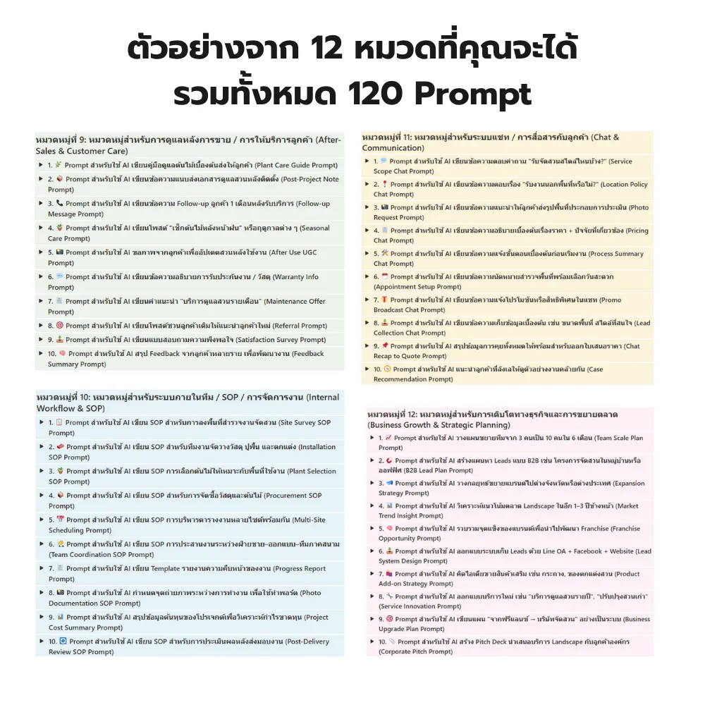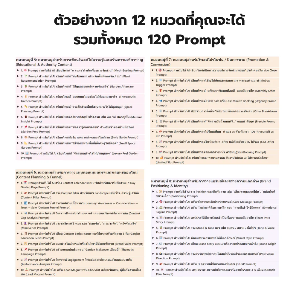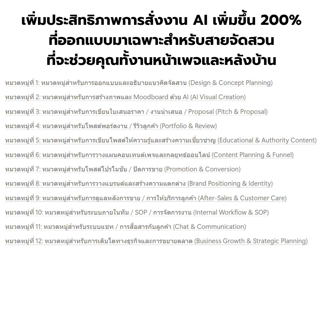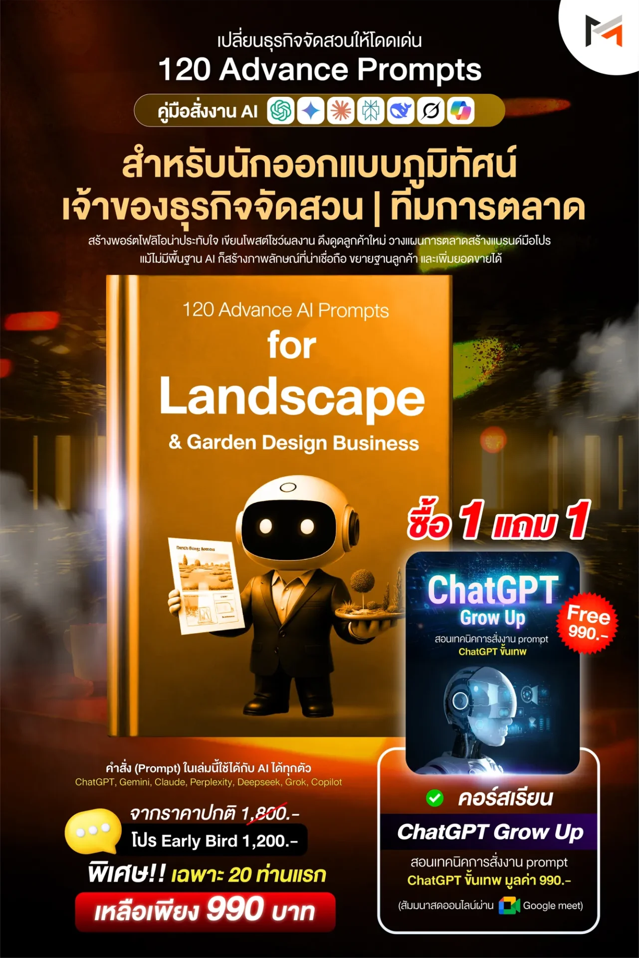 เล่มนี้เหมาะกับธุรกิจจัดสวนและออกแบบภูมิทัศน์ที่อยากให้ AI เป็นผู้ช่วยเบื้องหลังการคิด เขียน และโปรโมตแบบมืออาชีพ