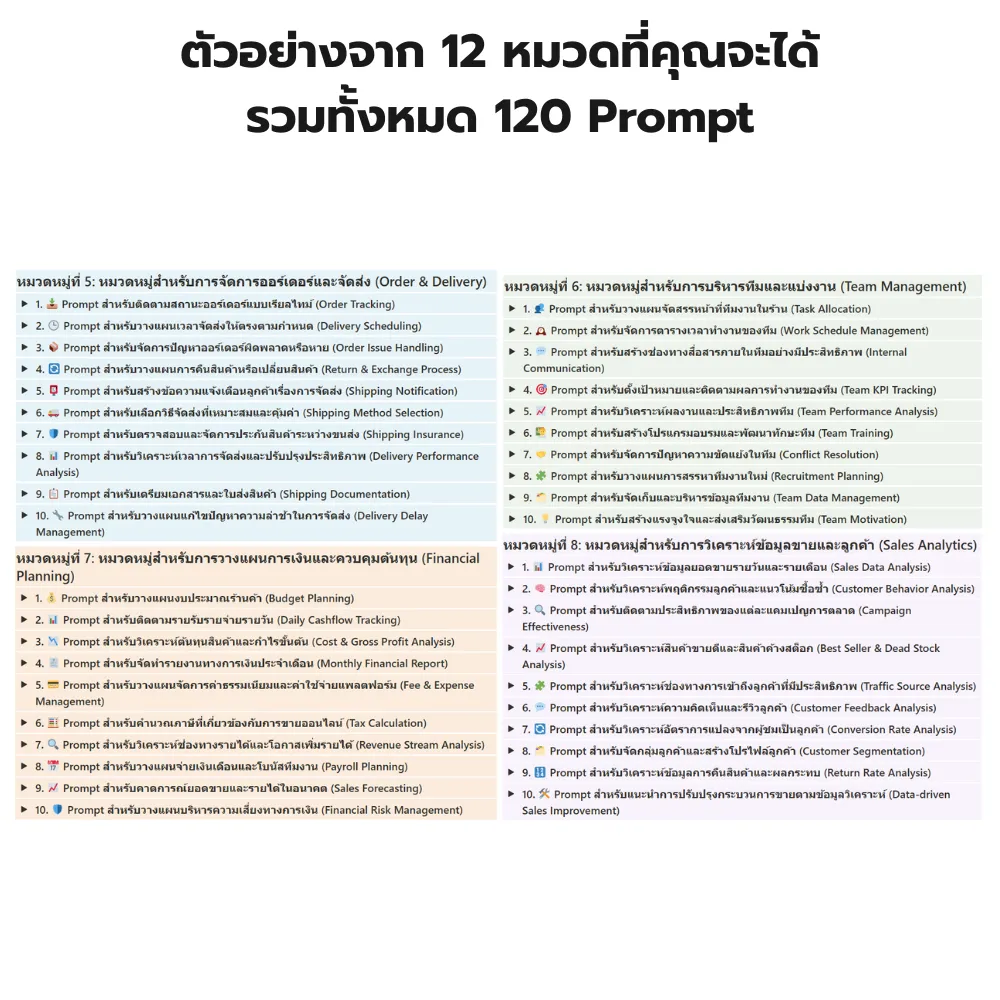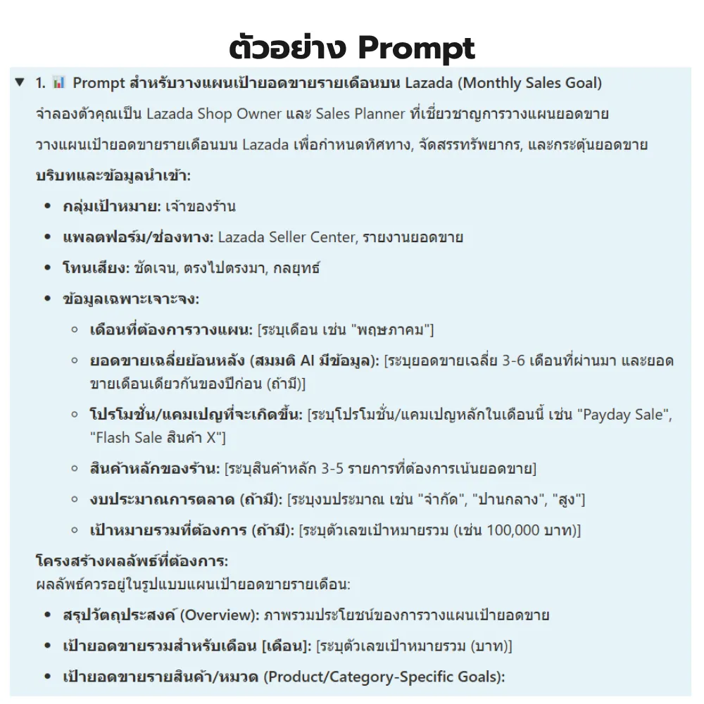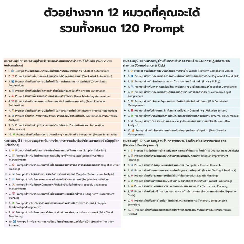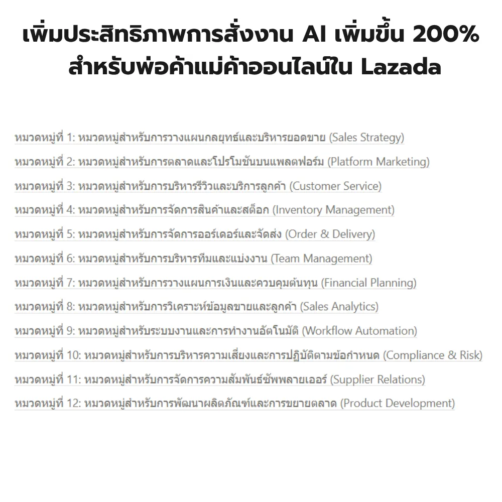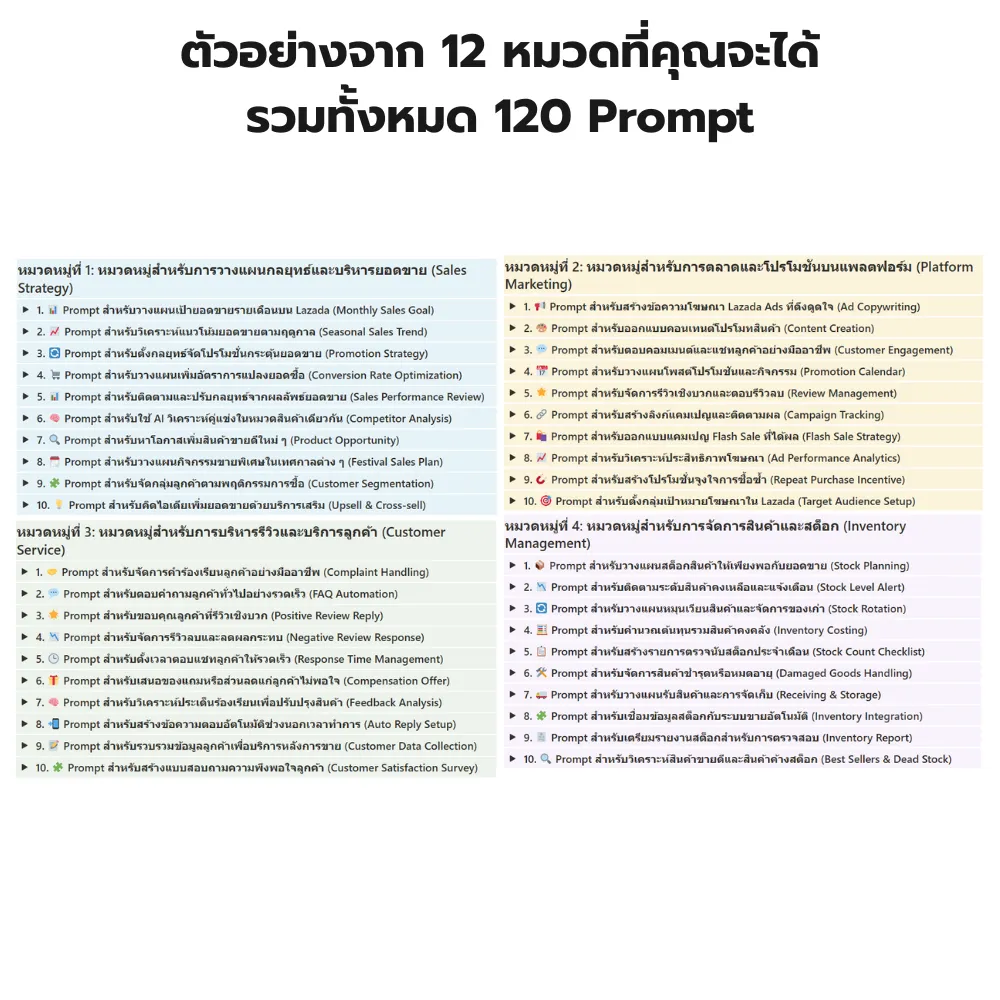 ✔ 120 Prompt พร้อมใช้ – ครอบคลุมทุกบทบาทของร้านค้า Lazada