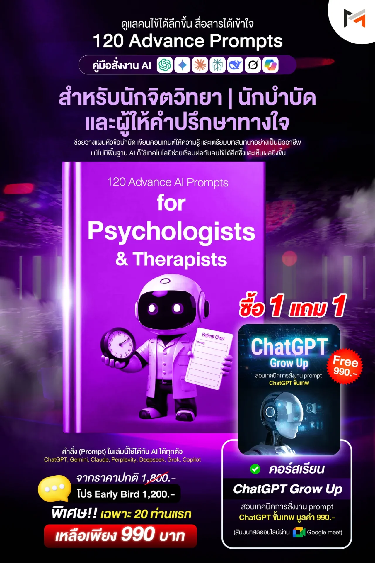 ถ้าคุณเป็นนักจิตวิทยา นักบำบัด หรือคนทำงานสายสุขภาพจิต ที่อยากใช้งาน AI อย่างถูกวิธีและทรงพลัง eBook เล่มนี้คือ “ผู้ช่วยมืออาชีพ” ของคุณ