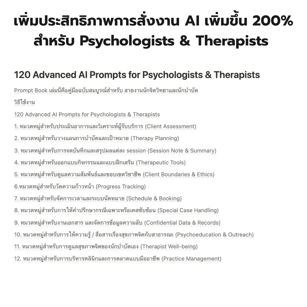 E-book 120 คำสั่งขั้นสูงสำหรับนักจิตวิทยาและนักบำบัดโดยเฉพาะ (Ultimate Prompt Book: 120 Advanced AI Prompts for Psychologists & Therapists)