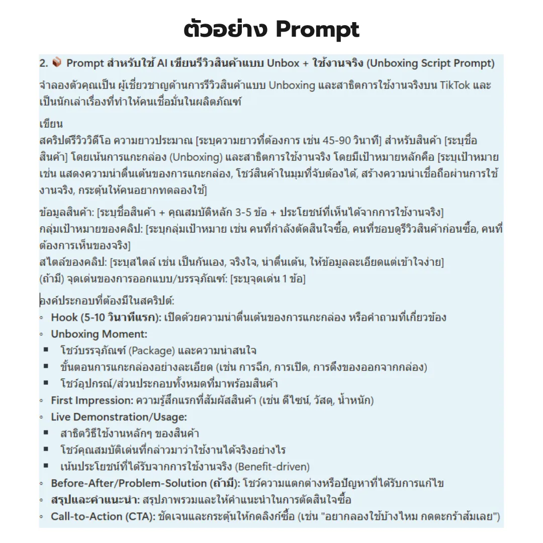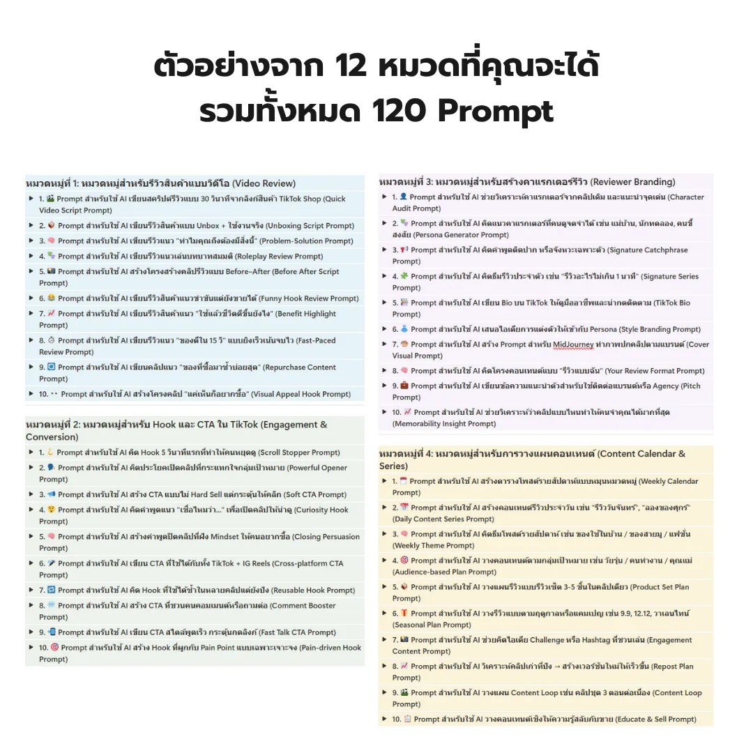 ✔ 120 Prompt สำหรับคิดสคริปต์รีวิว TikTok – สั้น กระชับ ขายเก่ง