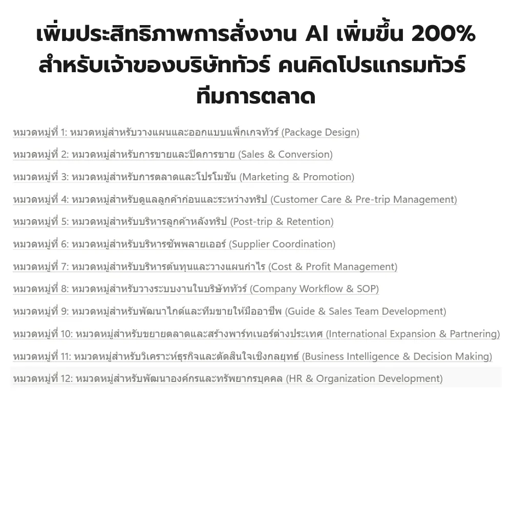เล่มนี้เหมาะกับธุรกิจทัวร์ทุกแบบ ที่อยากให้ AI ช่วยเขียนแทน คิดแทน และสื่อสารแทนในทุกขั้นตอน