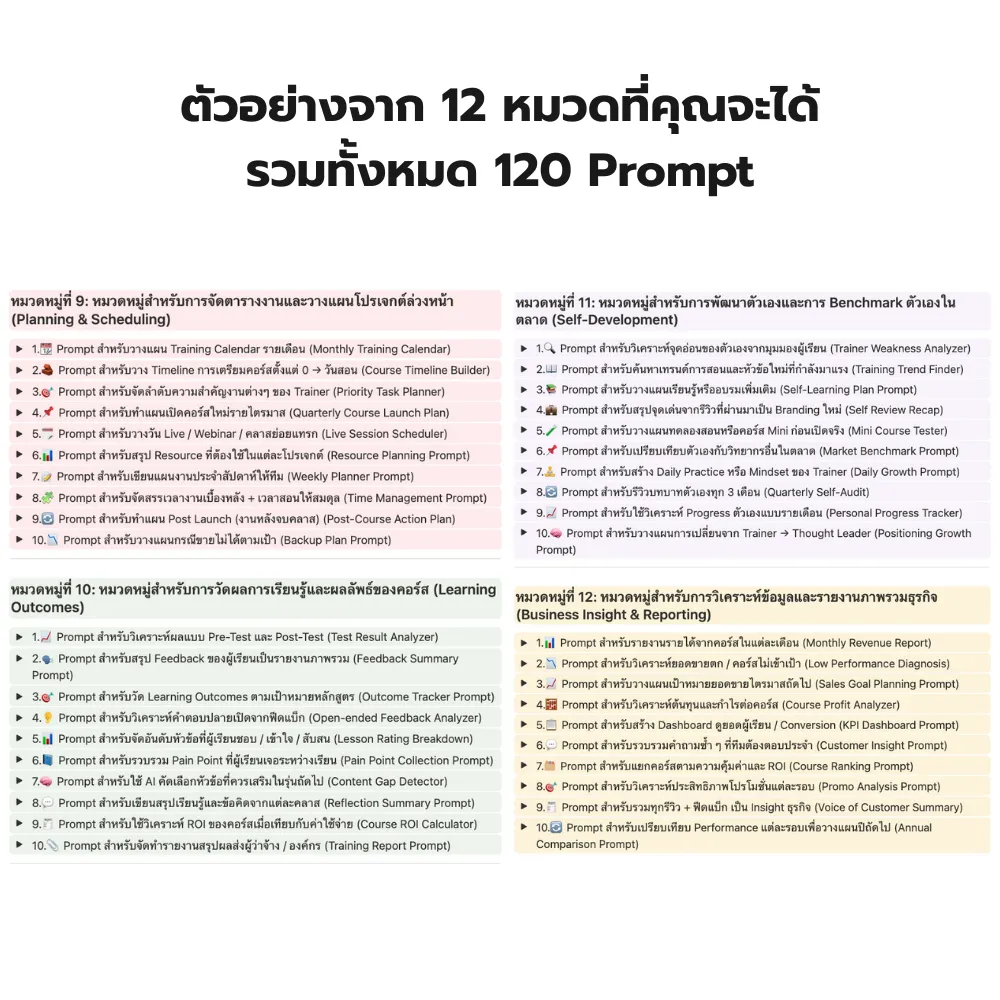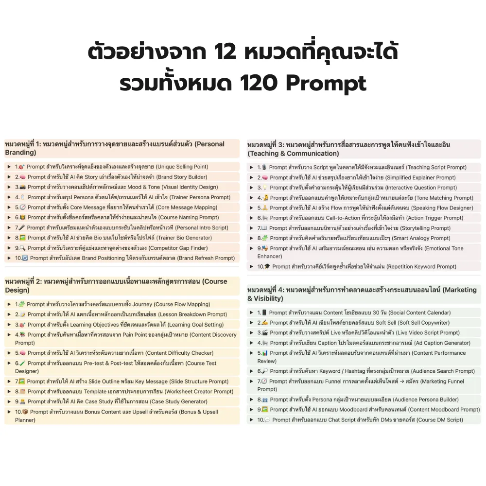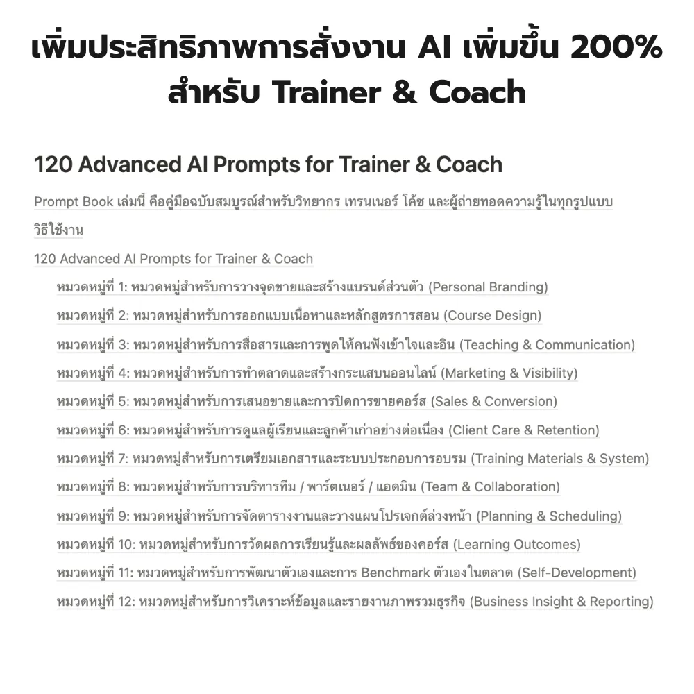 ✔ 120 Prompt สำหรับสาย Training และ Coaching – วางคอร์ส เขียนโพสต์ ตอบคำถาม และสื่อสารแบรนด์
