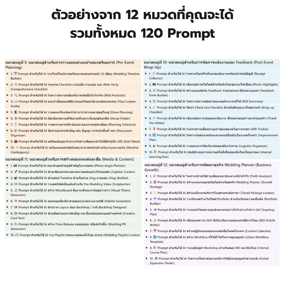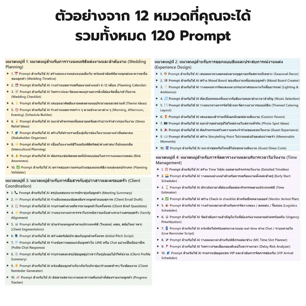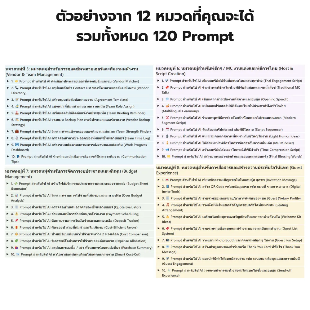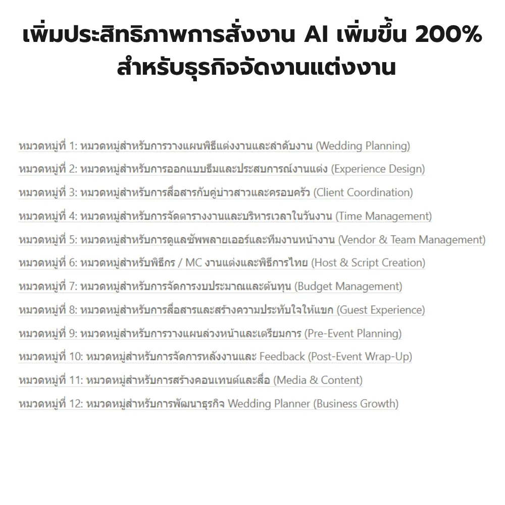 เล่มนี้คือ “ผู้ช่วย AI” ที่คุณใช้ได้ทุกวัน! ครอบคลุมทุกหมวดหมู่ ตั้งแต่การวางแผน ธีมงาน สื่อสารลูกค้า บริหารทีม MC พิธีไทย ไปจนถึงการสร้างคอนเทนต์และขยายธุรกิจ
