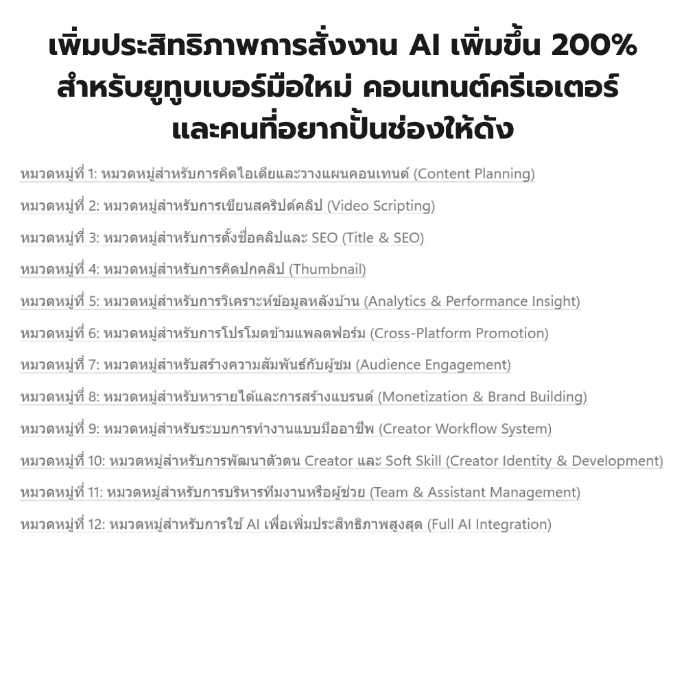 ✔ Prompt สำหรับคิดหัวข้อคลิป / เขียนสคริปต์ / ตั้งชื่อ SEO / ออกแบบปก / วางตารางลงคลิป